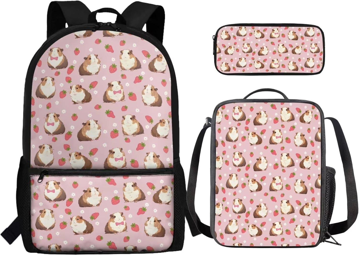 Cow Strawberry Backpack 5th Grade with Lunch Box for Girls Cute Cartoon School Bag and Lunch Bag Elementary School Bookbags/Lunchboxes/Pencil Case for Age 6 7 8