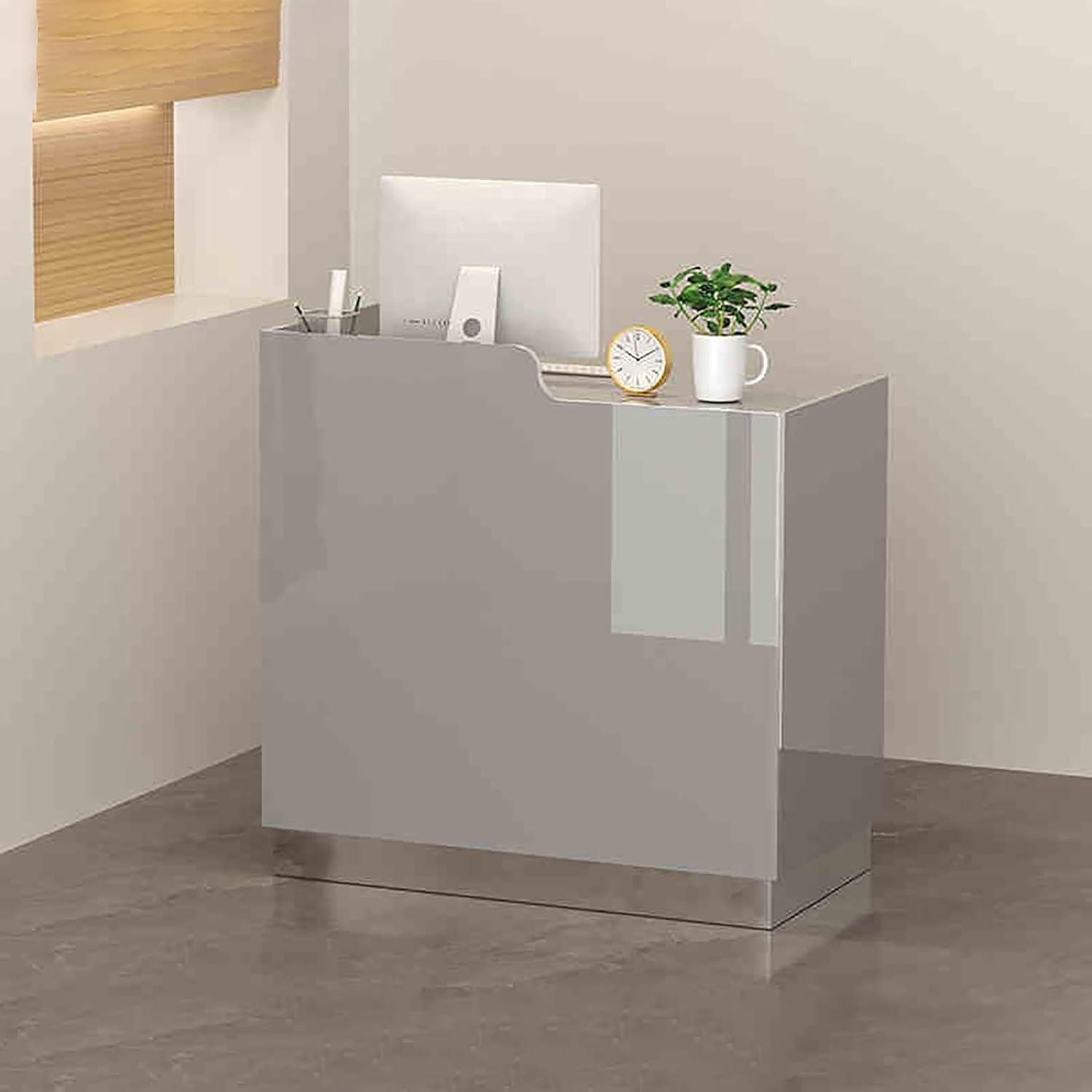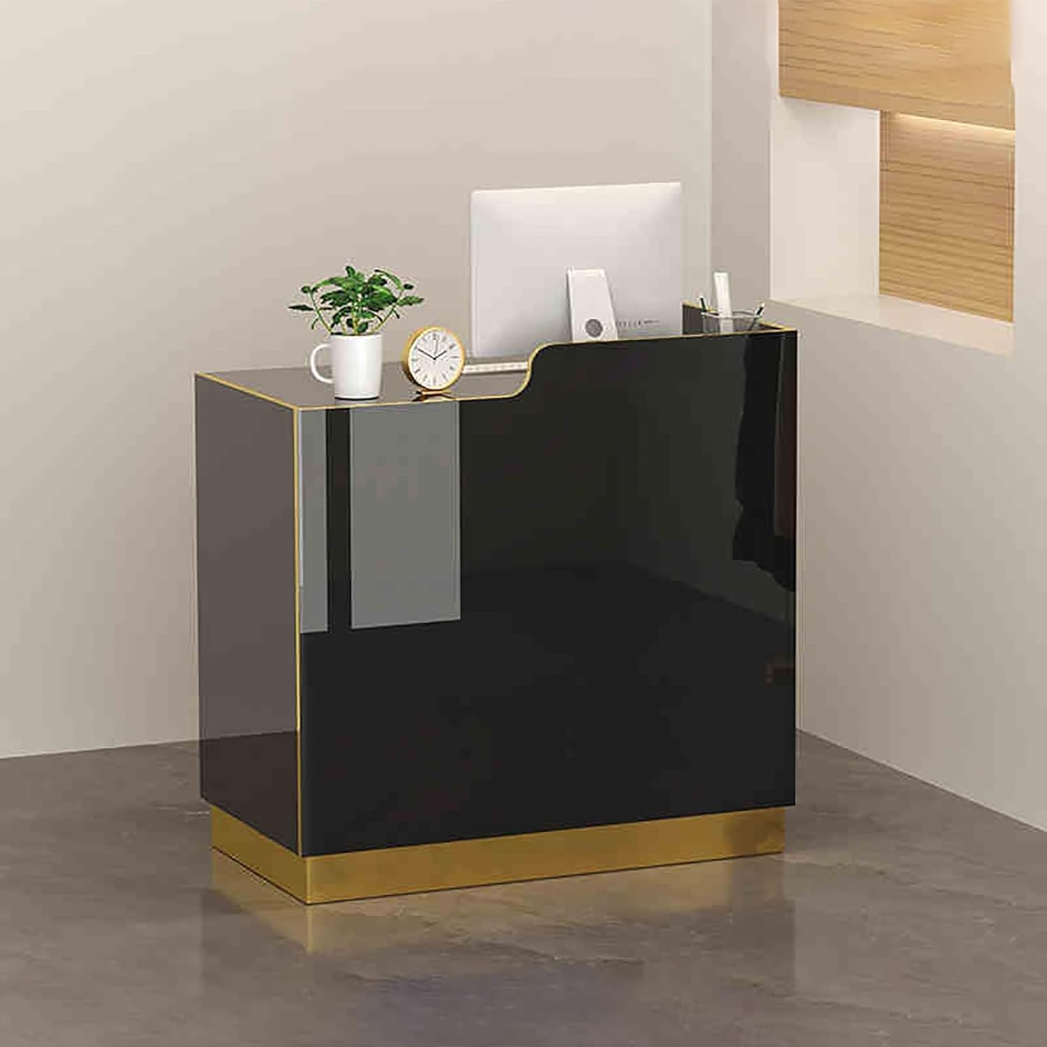 L-Shaped Reception Counter Table Reception Room Table Wooden Counter Desk Modern Reception Counter Desk with Lockable DrawersSecurity is a top priority, which is why this reception desk comes with Lockable Drawers. These drawers provide ample storage for important documents, office supplies, and personal items, ensuring everything stays secure and easily accessible. Whether you’re handling sensitive paperwork or just need a place to keep your belongings safe, the lockable drawers offer peace of mind.Crafted from sturdy wood, this Reception Room Table Wooden Counter Desk exudes elegance and professionalism. The natural wooden finish brings warmth to your reception area, creating a welcoming atmosphere for guests and clients. Its solid construction ensures long-lasting practical, withstanding the daily wear and tear of high-traffic environments like lobbies, salons, and offices.This L-Shaped Reception Counter Table maximizes your workspace, offering a spacious surface that accommodates computers, paperwork, office supplies, and more. Its ergonomic design enhances productivity by allowing you to efficiently manage multiple tasks from one central location. The L-shaped structure also ensures optimal use of space, making it ideal for both large and small reception areas.The Modern Reception Counter Desk is designed with sleek lines and a minimalist aesthetic, making it a stylish addition to any setting. Its contemporary design complements a wide range of interior décor, blending seamlessly into your existing workspace. This desk not only enhances the visual appeal of your reception area but also offers the practical benefits of a well-organized and efficient workspace.Material: Engineered Wood, MDFFocus on Details for Good ProductsReception DeskHigh-quality Metal RailThe Reception Counter Table has 1 drawers, which are equiped with metal slides. Open and close drawers smoothly.Reception DeskSoft Open &