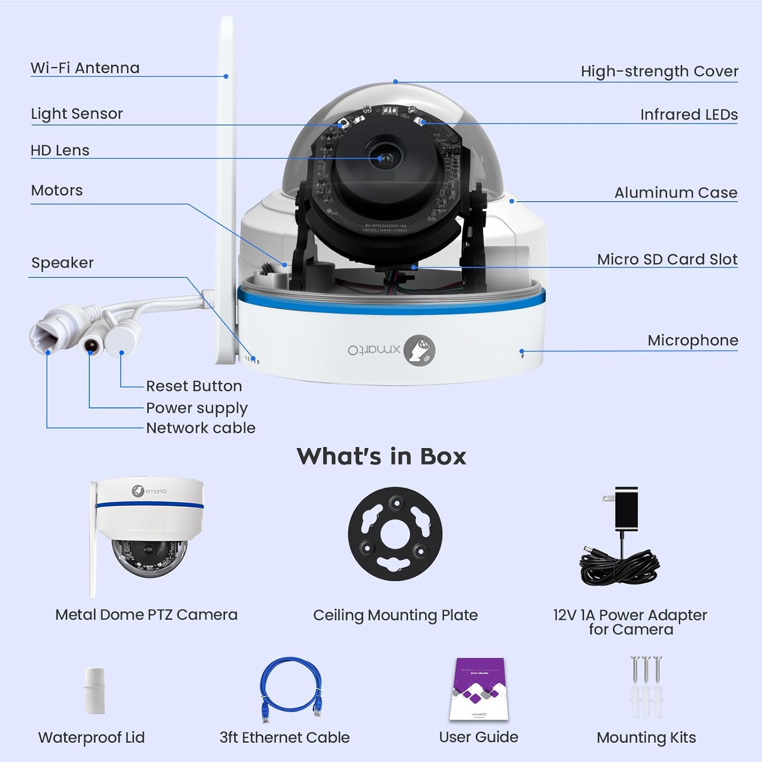 | BuiltIn Media | (1) 12V 1A DC Power Adapter, (1) 4K WiFi Dome PTZ Camera, (1) Ceiling Mounting Plate, (1) Mounting Hardware Bag, (1) User Guide |